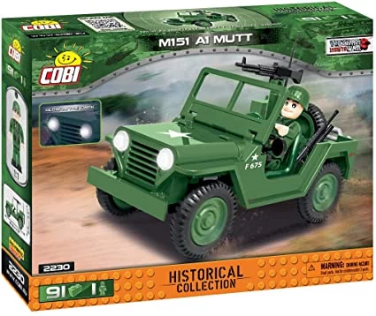 From the world of COBI comes a model of this fantastic vehicle. The characteristic shapes of the historic vehicle have been faithfully mapped using high-quality bricks. Utilising printed blocks rather than stickers not only means fantastic detail but durability when played with. Rotating wheels equipped with tires are ideal for moving the model during play. Under the tilting hood there is an engine, which, like the interior of the vehicle, can be freely modified according to your needs. A mobile machine gun, a radio station and a spare wheel are installed on the pace of the car. An American soldier with an M16 Special rifle is included in the set.