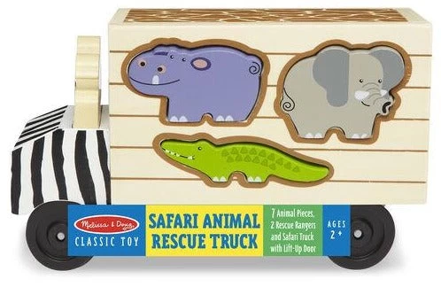 Animal rescue rangers to the rescue! With this rugged safari truck, two cheerful people are ready to zoom across the savanna to help their animal friends. The alligator, zebra, rhinoceros, elephant, giraffe, hippopotamus, and lion fit into the sides of the wooden truck through die-cut slots, so this exciting toy is perfect for imaginative play and fine motor skills . . . and much more! Lift and remove the cargo door to unload the colorful animals, then count and stack the solid-wood pieces before loading the truck and securing the door in its track. One male and one female ranger fit in the cab of the truck, or come out to tend to the animals on the preserve. Play ideas are included to reinforce basic skills and inspire creative play.