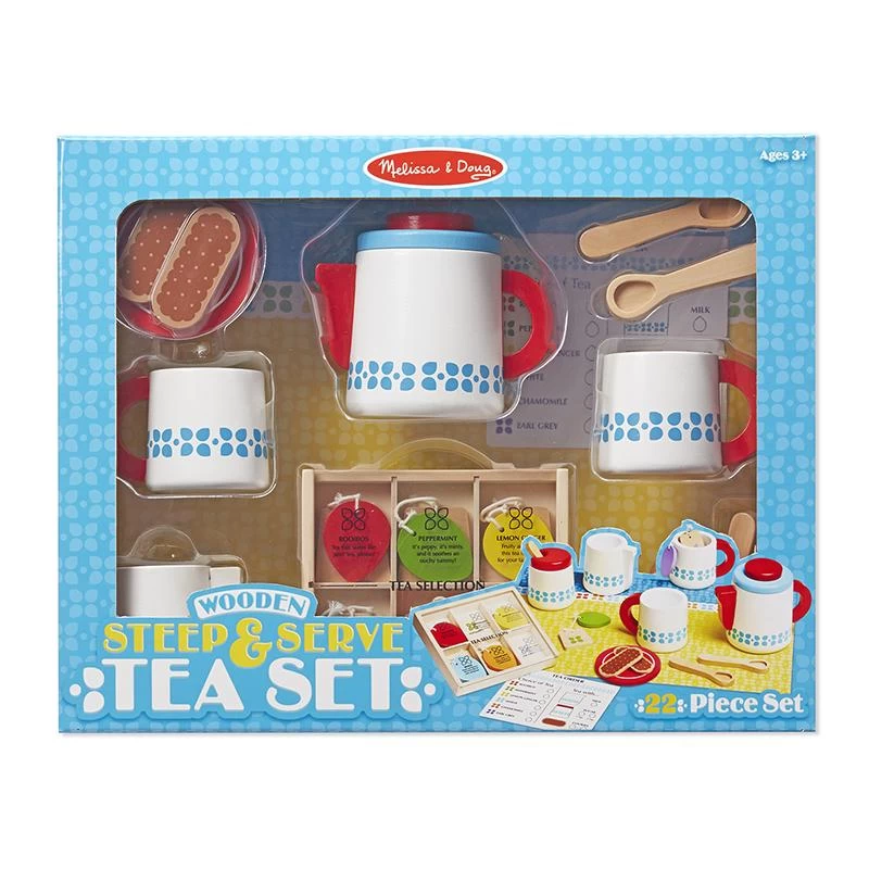 Everything needed to host the perfect tea party! Includes teapot with lid, 2 cups, 2 spoons, a sugar bowl, milk pitcher, 6 tea varieties, and 2 cookies. Tea bags with brightly colored tags store in a handy tea caddy and the wipe-off order card makes tea selection a snap.