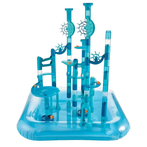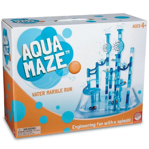 Have a wet and wild marble ride with the Aqua Maze Twist Water Marble Run. From water wheels and a whirlpool vortex to spouts and spinners, kids are having engineering fun with a splash. Kids will get their feet wet exploring basic physics as they build, pour, splash, and laugh. Fun with or without water. Aqua Maze includes 82 building pieces, 15 floating marbles, inflatable plastic mat and large scoop.