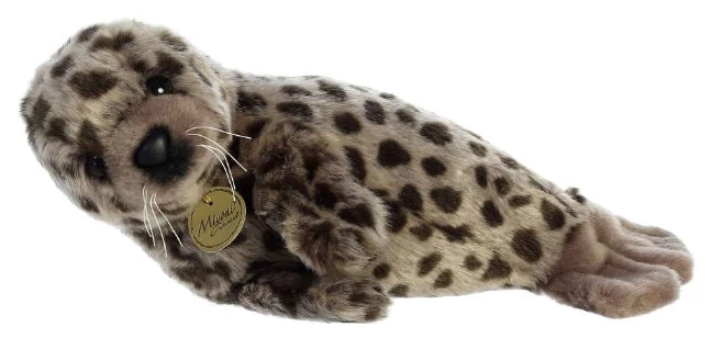 Miyoni features your favorite animals in plush form with a simultaneously realistic and adorable design! If you are looking for a unique and exotic animal friend, this Miyoni Harbor Seal is the perfect addition to your plush collection! This Harbor Seal has a speckled body and lays on its side.