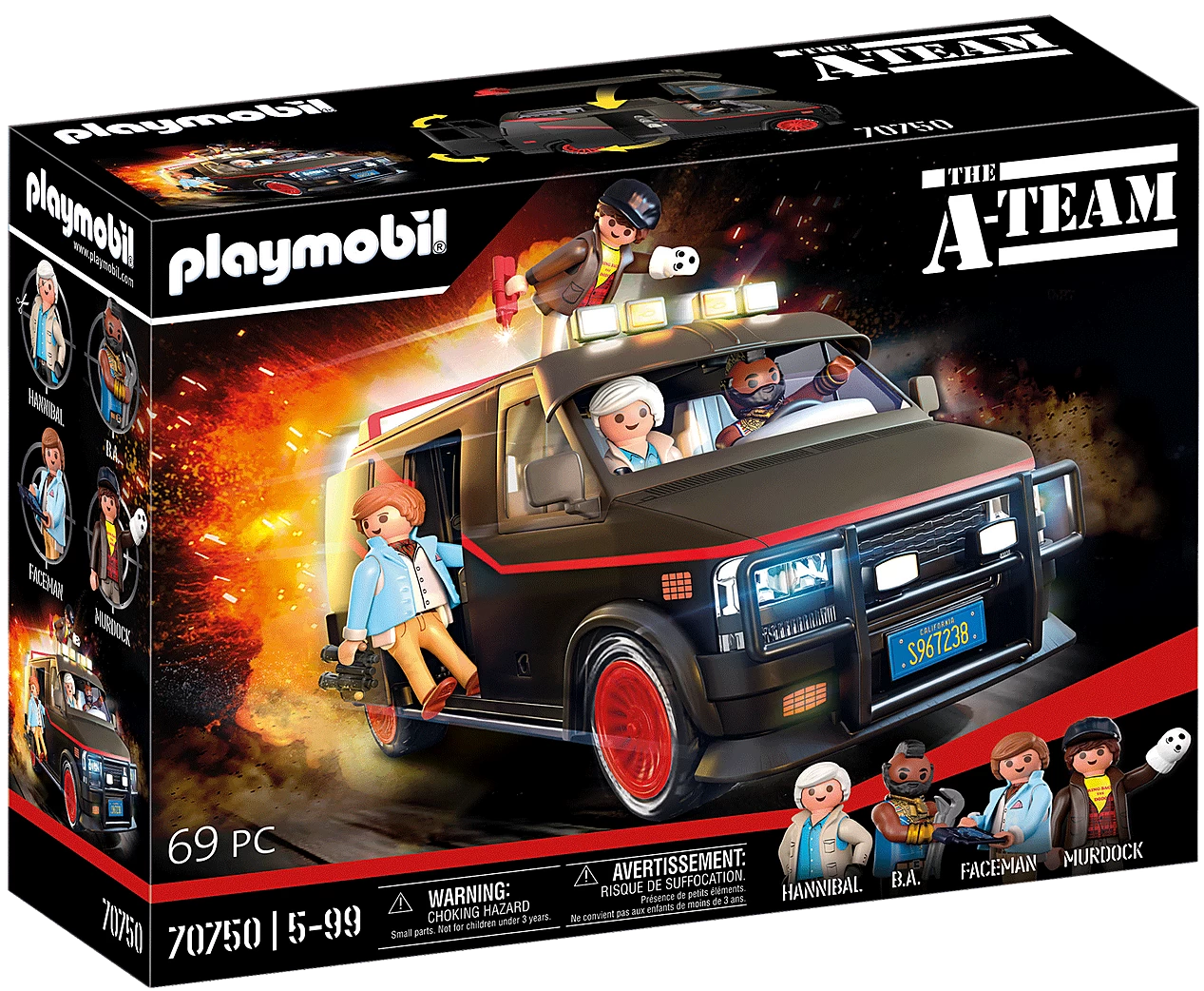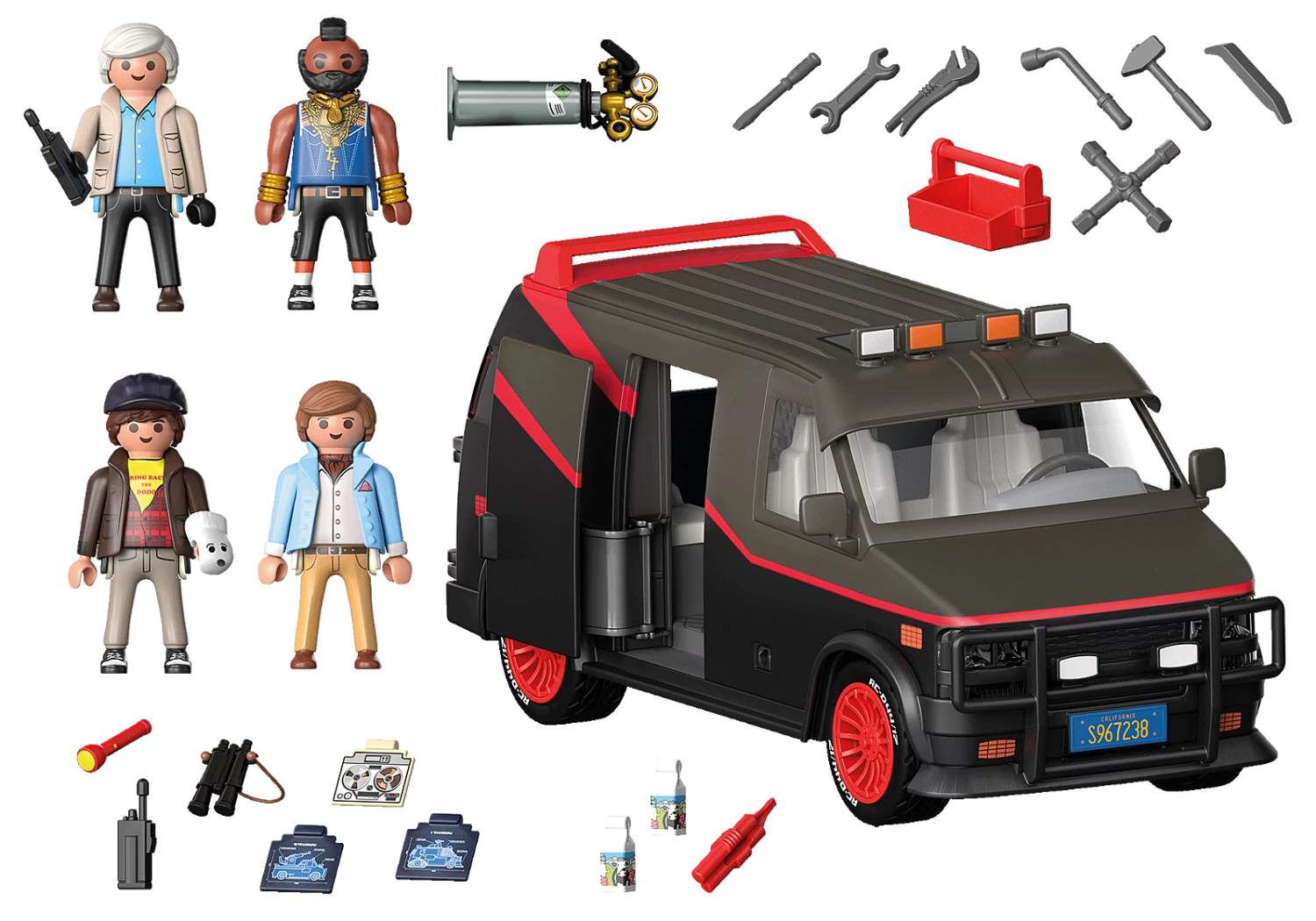 The A-Team are four ex-elite soldiers on an unusual mission. Sent to prison by a military court for a crime they did not commit, they escaped and now help others in need. If you have a problem, if no one else can help, and if you can find them, maybe you can hire, the A-Team. Besides Hannibal, B.A., Face and Murdock, the fifth team member is definitely the mega-cool A-Team Van. With its extensive interior equipment with monitor, welding machine, operation boards, cabinet and perforated wall for various accessories, the van is well equipped for any special operation. Of course, all team members find space inside the van. The roof inserts can be removed for easier play. Like the original, the PLAYMOBIL A-Team Van also has the iconic three colour painting, an extended sun visor and red rims. A highlight not only for movie car collectors and A-Team fans, but also PLAYMOBIL fans! The set includes Hannibal, B.A., Face and Murdock, as well as a van with space for five figures. The side door and tailgate of the van can be opened.
