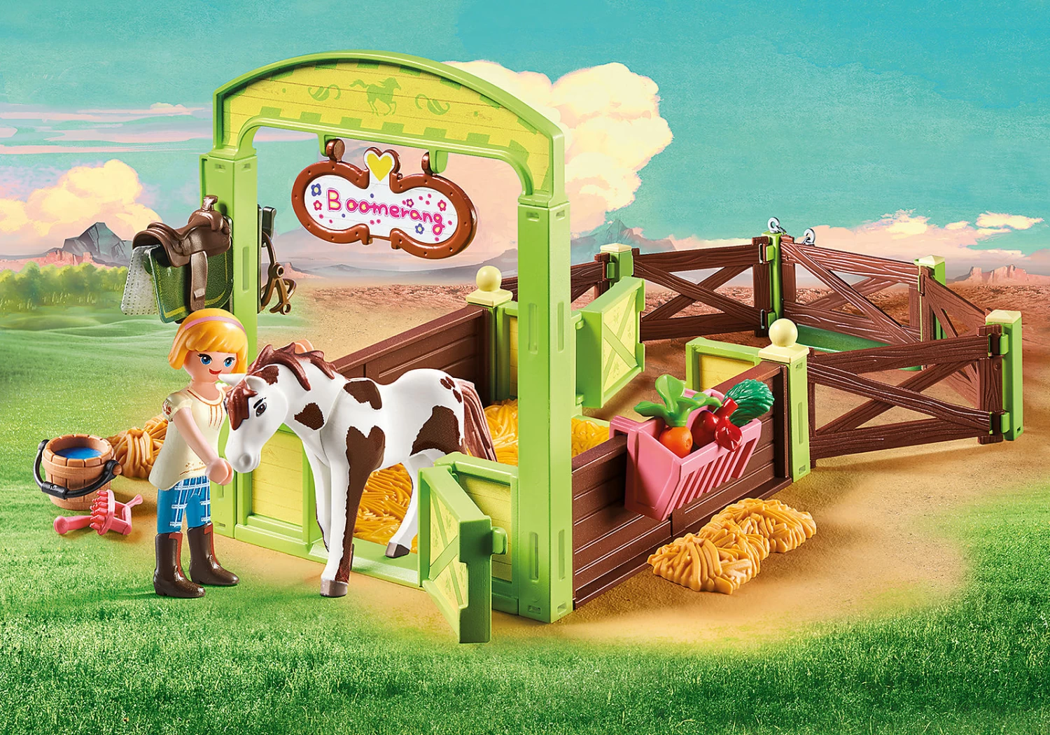 Figures: 1 Abigail Animals: 1 horse Boomerang Accessories: 1 horse box, 1 post adapter, 1 gate, 4 gates, 2 fence posts, 4 fence adapters, 1 straw insert, 2 straw, 1 grass bundle, 1 apple, 1 carrot, 1 feeding rack, 1 water bucket, 1 western saddle, 1 halter, 1 rein, 1 horse blanket, 1 whip, 1 brush