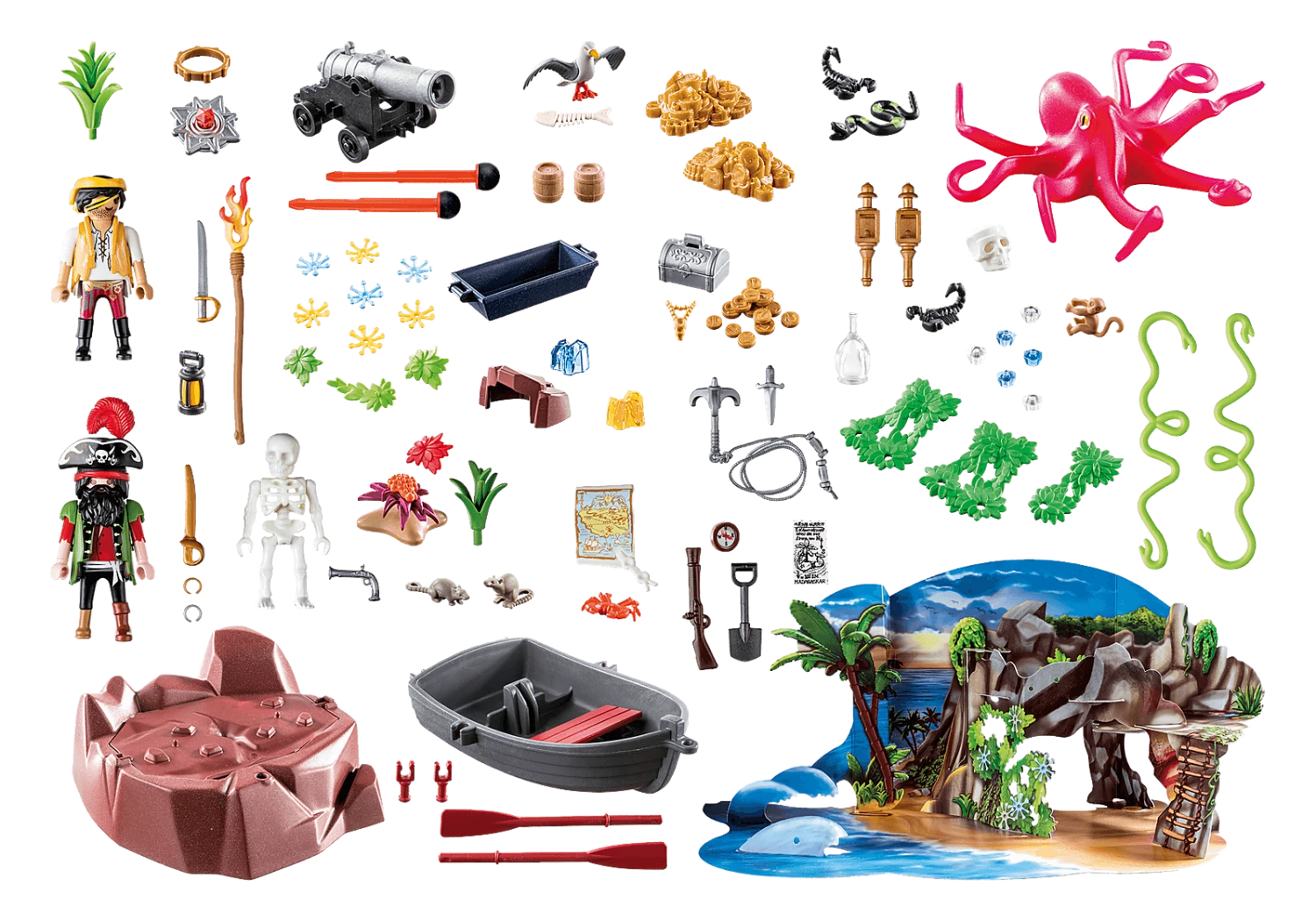 Accessories: 2 sabres, 2 arm cuffs, 1 pirate hat, 1 treasure map, 1 bottle, 1 musket, 1 spade, 1 compass, 1 dagger, 1 grappling hook, 1 torch, 3 lanterns, 2 oars, 2 gold mountains, 1 bush, 3 leaves, 6 flowers, 1 cannon, 2 bullets, 1 trough, 2 barrels, 2 lianas, 1 map, 1 rock with hiding place, 1 amulet with diamond, 2 tufts of grass, 1 skull, 1 crown, 1 chest, 1 necklace, 10 gold coins, 1 flower, 1 piece of sand, 1 skeleton, 1 pistol, 1 rock, 2 diamonds, 1 fish crater