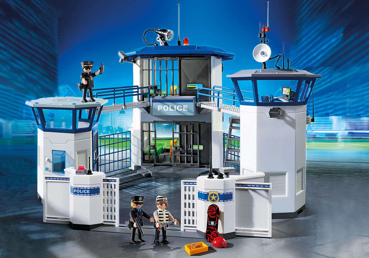 Accessories: 1 police gate, 2 surveillance towers, 1 prison, 2 bars, 2 bridges, 2 chairs, 2 benches, 1 skateboard, 1 helmet, 1 crate, 1 gold chain, 1 baton, 1 walkie-talkie, 1 surveillance camera, 1 ladder, 2 spotlights, 1 satellite dish, 7 antennas, 1 sign