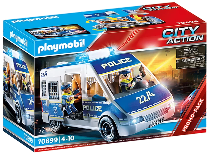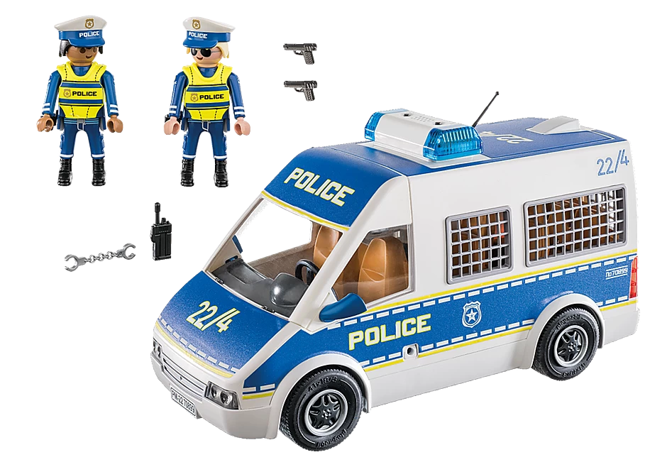 Accessories: 1 police van, 2 police caps, 2 waistcoats, 2 holsters, 2 pistols, 1 pair of handcuffs, 1 walkie talkie
