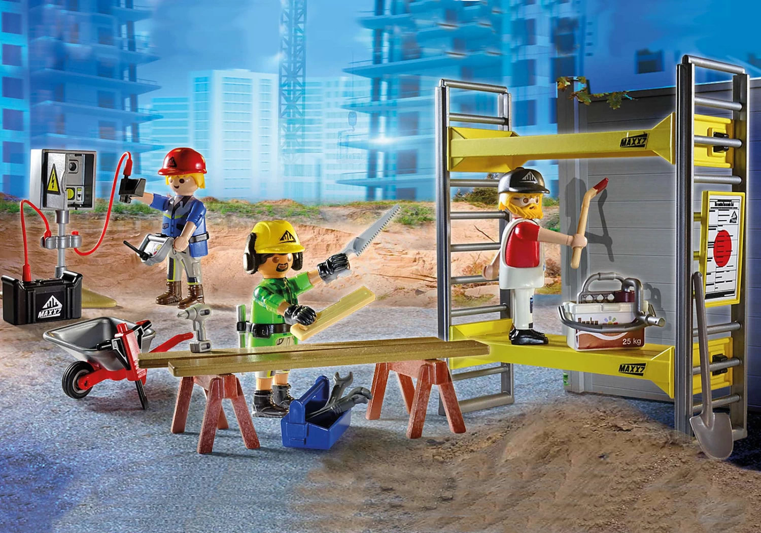 Figures: 3 construction workers Accessories: 2 scaffolding side parts, 2 scaffolding tracks, 1 fuse box, 1 battery, 1 screwdriver, 2 cables, 1 control unit, 1 brush, 1 paint roller, 1 paint grid, 1 paint bucket, 1 saw, 2 boards, 1 cordless screwdriver, 1 tool box, 1 spirit level, 2 construction helmets, 1 peaked cap