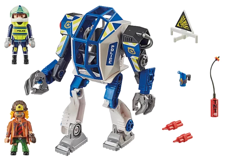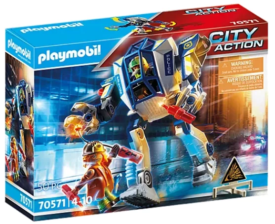For particularly dangerous special operations the police use their practical police robot. A malicious bank robber tries to blast his way into the bank with explosives. But the policeman undaunted climbs into the robot’s cockpit and directly goes into the danger zone. Cleverly he steers the robot towards the bad guy and quickly uses his gripping arm to take the explosive device out of his hand. Then the fire devil is grabbed by the leg and transported to the nearest police station. The playset contains two PLAYMOBIL figures, a police robot with movable legs and arms, explosive device, warning sign, helmet, gloves and many other extras.