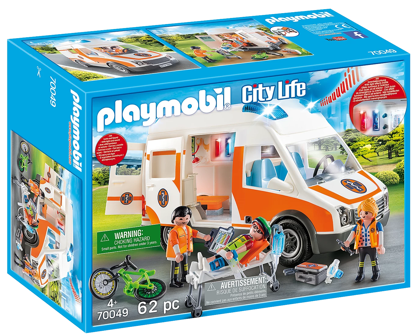 Figures: 2 paramedics, 1 injured man Accessories: 1 ambulance with flashing light and sound, 1 patient couch with fixation strap, 1 doctor’s case, 1 IV stand, 1 IV bottle with tube, 1 resuscitator bag, 2 tubes, 2 splint dressings, 1 index card, 2 monitor inserts, 1 fire extinguisher, 1 set of surgical instruments, 1 sheet of labels with dressing material, 1 bicycle, 1 bicycle helmet