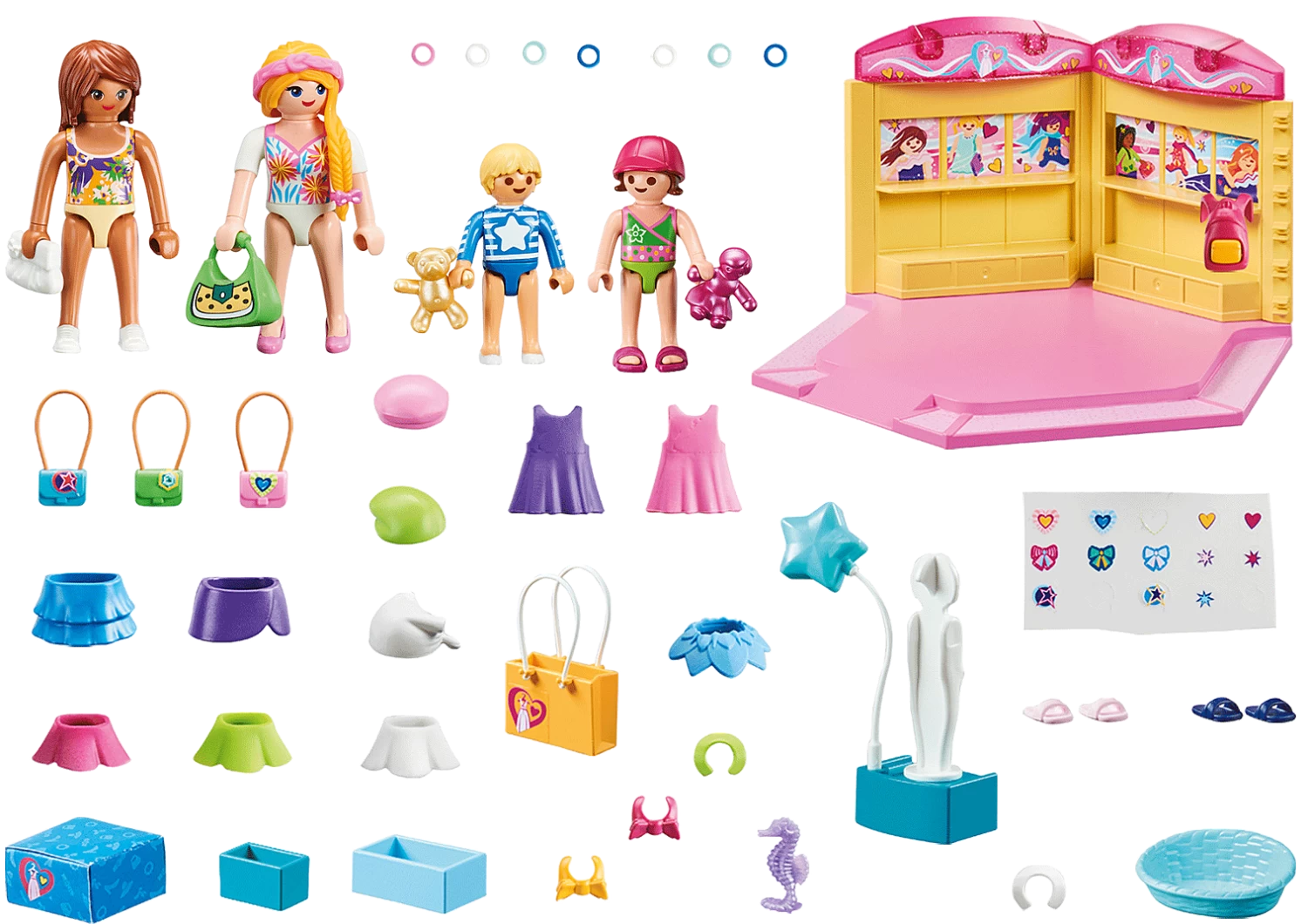Accessories: 1 Kids Fashion Store, 2 boxes, 1 basket, 1 box, 1 mannequin with balloon, 1 shopping bag, 7 bracelets, 2 stand-up collars, 2 neck bows, 1 clutch, 1 handbag, 3 children’s handbags, 1 hair bow, 1 hair ribbon, 1 teddy, 1 doll, 1 seahorse, 3 pairs of children’s sandals, 1 cap, 2 caps, 1 headscarf, 2 women’s skirts (2 pieces each), 4 children’s skirts, 2 children’s dresses, 1 backpack, 1 sticker sheet for designing and decorating