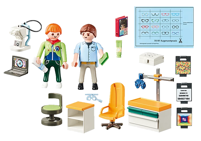 Figures: 1 doctor, 1 woman Animals: none Accessories: 1 eye examination device, 1 chest of drawers with device for determining the visual acuity, 1 treatment chair, 1 doctor’s stool, 1 shelf, 3 visual test panels, 1 pair of measuring glasses, storage box for glasses, 1 laptop, 1 sticker sheet with glasses models, 1 book, 1 file, 2 tubes of ointment