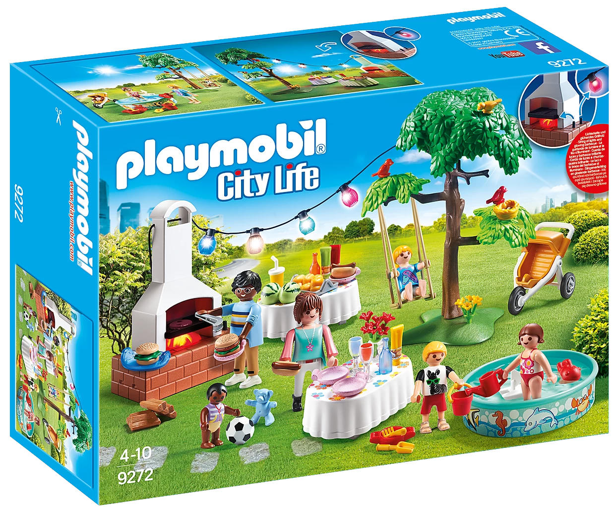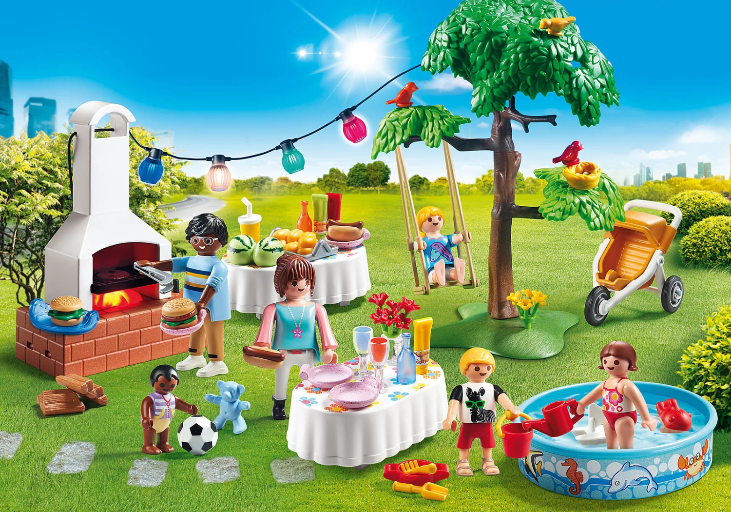 Figures: 1 man, 1 woman, 2 girls, 1 boy, 1 baby; Animals: 3 birds; Accessories: 1 stone barbecue, 1 tree with children’s swing, 1 paddling pool, 2 tables, 1 pram, 1 lantern chain, 2 trays, 4 plates, 2 bottles, 2 champagne glasses, 1 drinking cup, 1 punch bowl, 3 tubes, 1 grill tongs, 1 cake knife, 2 burgers, 2 hot dogs, 1 roll, 1 football, 2 logs of wood, 1 watermelon, 1 bird’s nest, 1 teddy bear, 1 toy catamaran, 1 sand toy, 1 toy fish, 1 bouquet of flowers