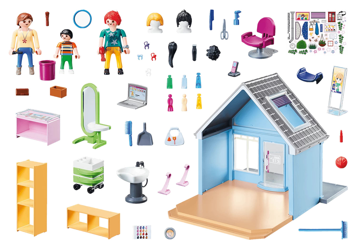 Accessories: 1 hair salon, 1 counter with display, 1 laptop, 1 standing mirror, 2 shelves, 2 stands, 1 hairdresser’s cart, 1 sign, 1 hair wash basin, 1 hairdresser’s chair, 1 booster seat, 3 hairpieces, 2 exchange wigs, 2 busts, 1 hand mirror, 1 telephone, 1 spray bottle, 1 hair dryer, 1 brush, 1 mascara, 1 lipstick, 1 scissors, 1 razor, 1 powder brush, 1 powder, 6 cosmetic bottles, 6 hair bows, 1 watch, 1 wallet, 1 broom, 1 dustpan, 1 trash can, 1 box, 1 color palette, 1 handbag, 1 sticker sheet with reusable stickers