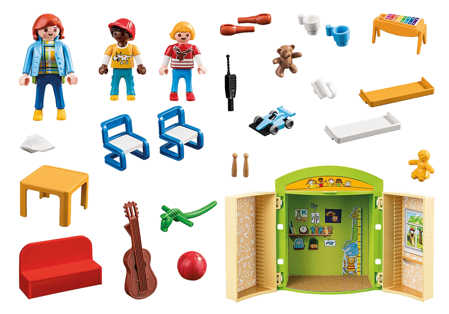 Accessories: 2 children’s chairs, 1 children’s table, 1 toy car, 1 xylophone with clappers, 1 hula hoop, 1 teddy bear, 2 backpacks, 1 walkie talkie, 1 hobby horse, 1 ball, 1 guitar, 2 skittles, 2 cups, 1 paper airplane