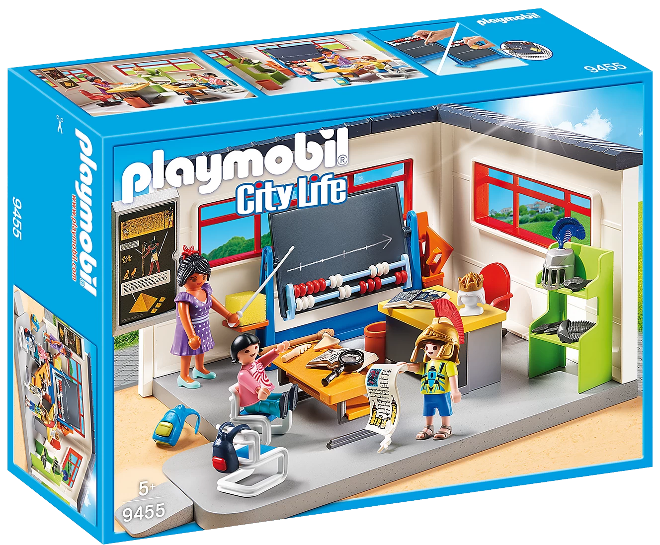 Figures: 1 woman, 1 girl, 1 boy Accessories: 1 classroom, 1 roof element, 1 shelf, 1 desk, 1 swivel chair, 1 school bench, 2 chairs, 1 waste basket, 1 blackboard with slide rule, 1 pointing stick, 2 storage compartments, 1 geo triangle, 1 ruler, 1 pen, 1 sponge, 1 monitor, 1 magnifying glass, 2 suspension files, 1 document, 2 books, 1 bone, 4 weapon tips, 1 axe, 1 fossil, 1 bust, 1 crown, 1 helmet with tail, 1 knight’s helmet with feather, 2 backpacks, 1 dress (two-piece), 1 hair blossom