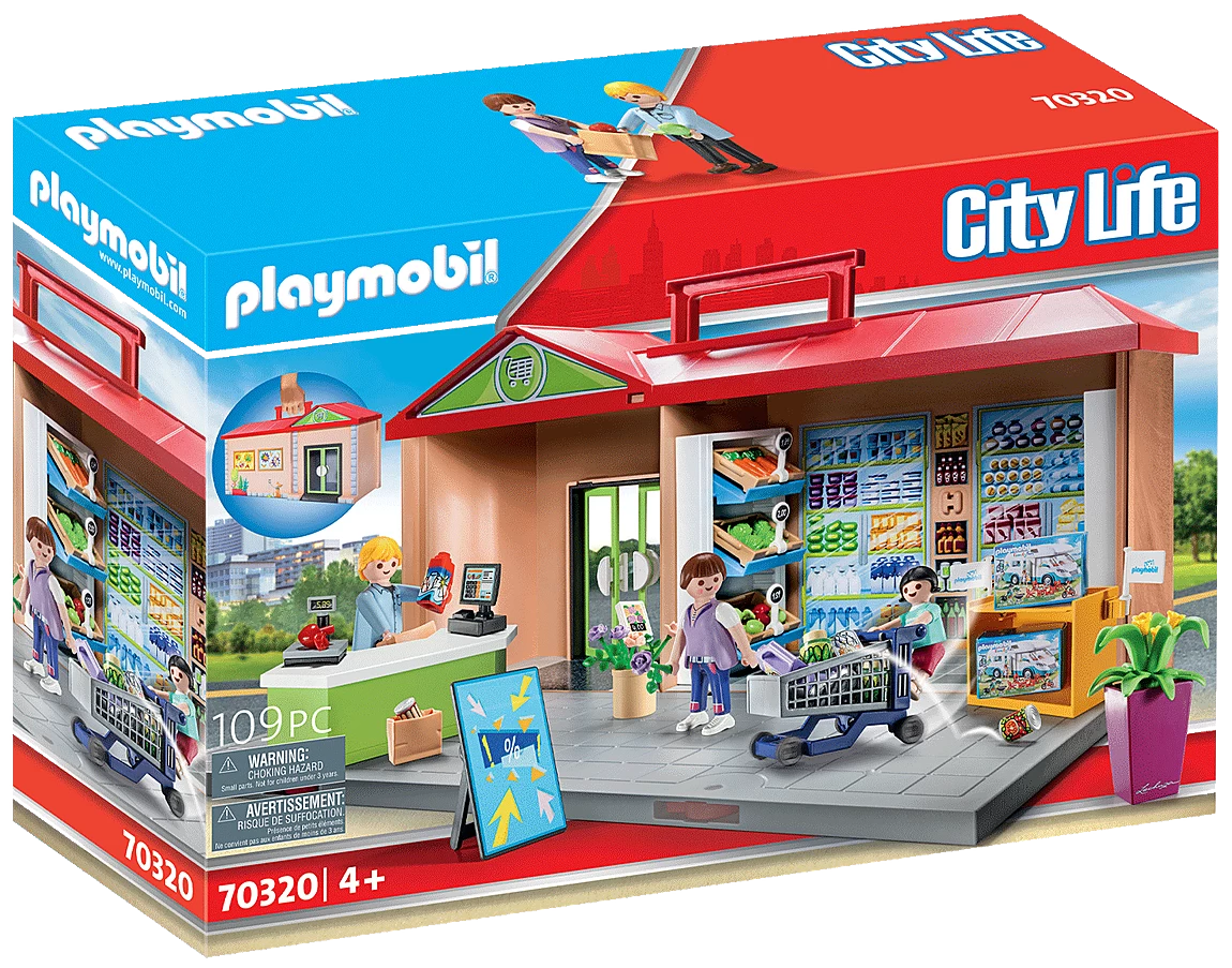 Shop for all the necessities at the Take Along Grocery Store. Grab your cart and fill it with fresh produce or choose pantry items off the shelves. Once you have everything you need, checkout at the counter. In a convenient take-along case, this set is perfect for on-the-go fun. Simply fold down the front wall to create the store floor and start your shopping trip.