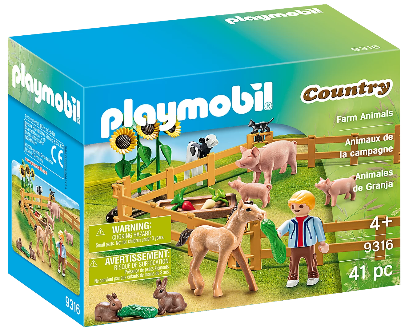 Animals: 1 foal, 1 calf, 1 pig, 2 piglets, 2 rabbits, 1 kitten