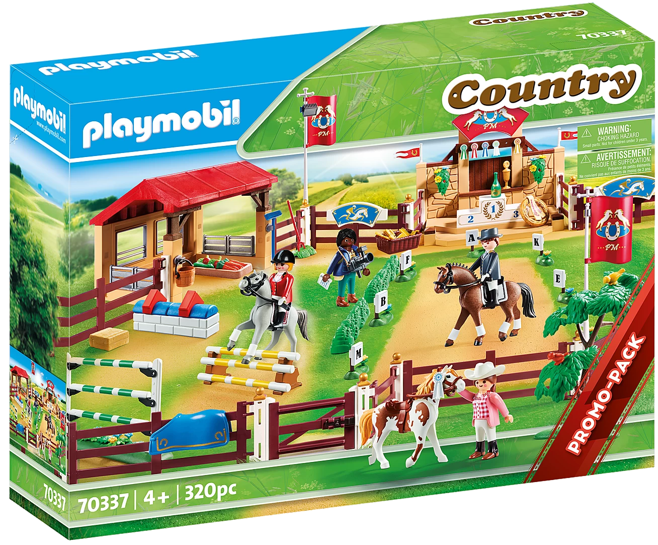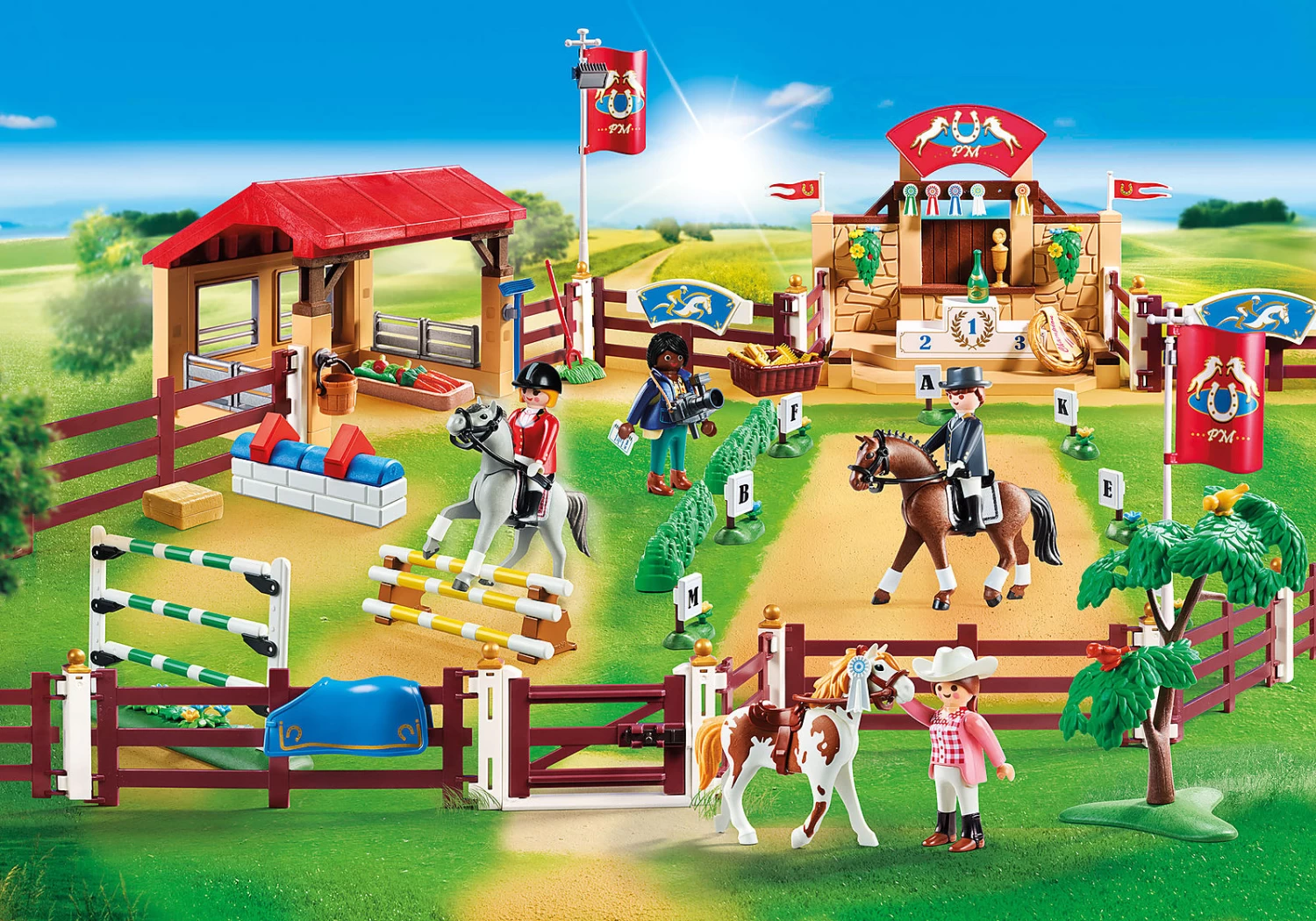 Figures: 2 female riders, 1 male rider, 1 female journalist Animals: 1 horse german sport horse, 1 horse arab, 1 horse pinto, 2 birds Accessories: 1 horse shelter, 1 victory tribune, 1 winner’s platform, 3 horse halter, 3 horse saddle, 3 reins, 2 riding crops, 1 horse blanket, 6 horse accessories for cleaning, 7 fence elements large, 4 fence elements small, 2 fence gates, 4 fence brackets, 4 fence posts with golden ball, 4 fence signs, 2 flagpoles with flags, 8 track figures dressage, 1 obstacle wall, 1 obstacle hedge, 1 obstacle poles large, 1 obstacle poles small, 1 tree, 1 basket, 1 bucket, 1 broom, 1 hay fork, 1 feeding trough, 1 cup, 6 tournament ribbons, 1 champagne bottle, 1 victory wreath, 1 riding helmet, 1 cylinder, 1 cowboy hat, 1 note board, 1 camera, 1 MP3 player, 1 straw bale, 1 green fodder large, 1 green fodder small, 1 hay bale, 1 bunch of carrots, 2 apples, 2 spotlights, 6 cards