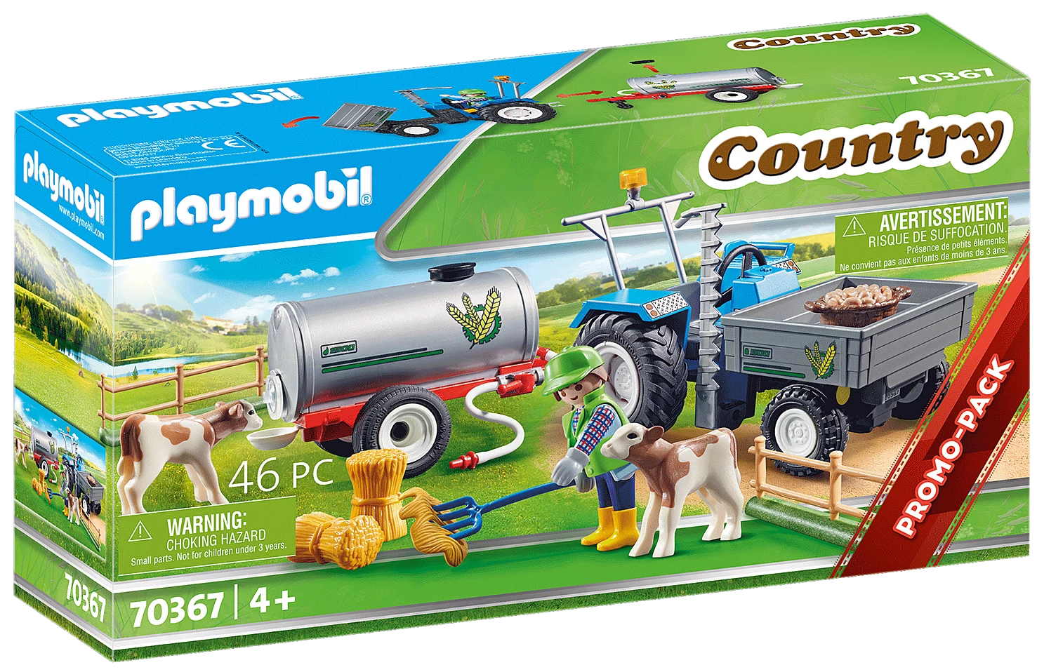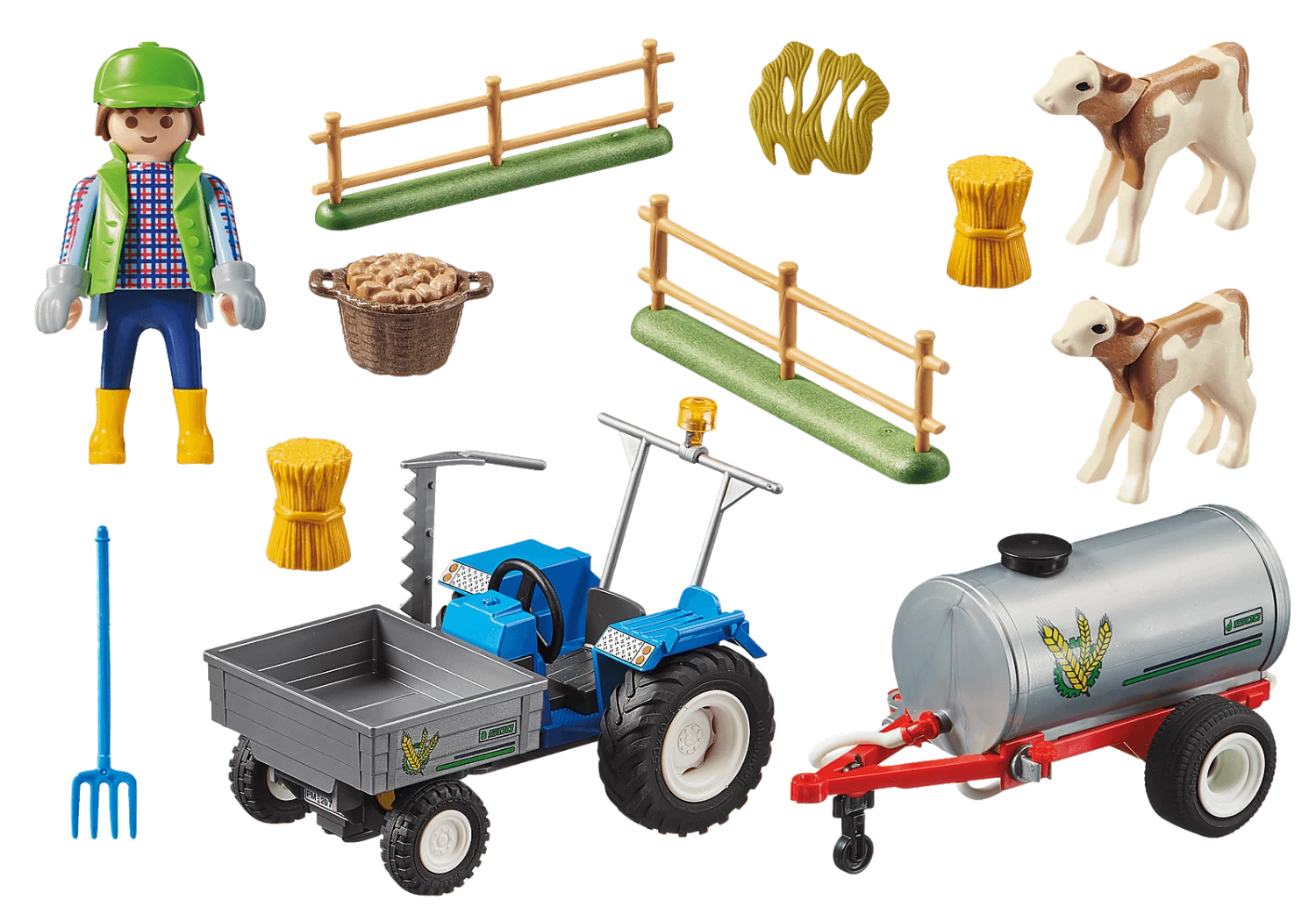Accessories: 1 loading tractor, 1 trailer with water tank, 2 fence elements, 1 feed basket, 2 straw bales, 1 straw, 1 rake, 1 visor cap, 1 pair of gloves