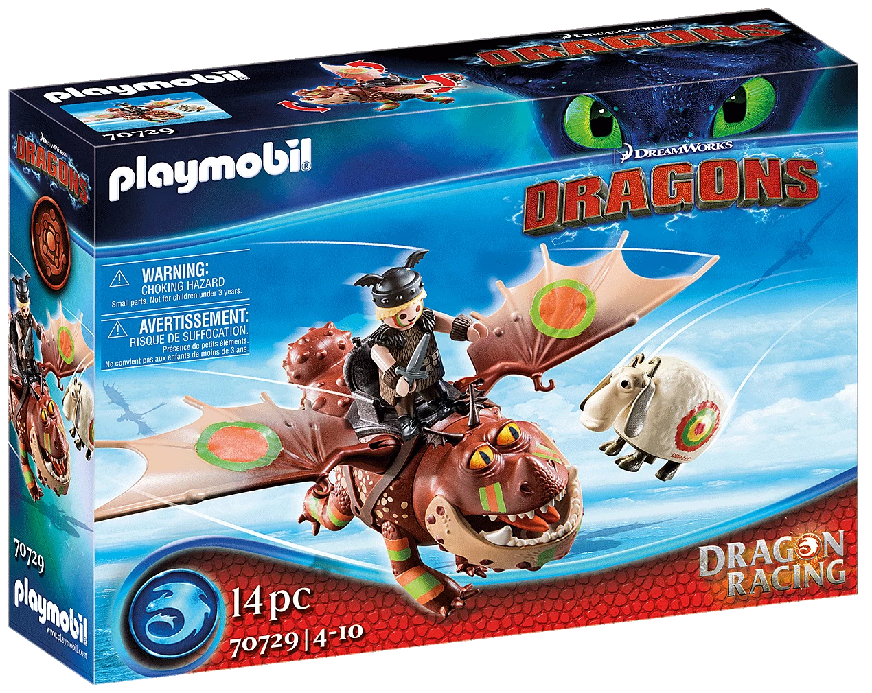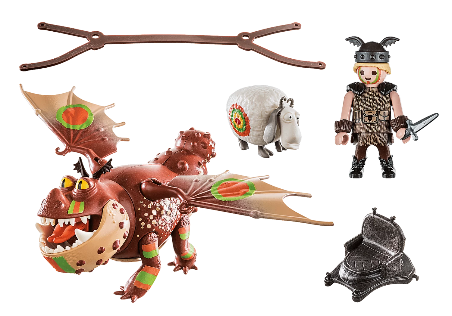 Fishlegs and his gluttonous dragon Meatlug are also equipped with the cool new racing look. Although the two are constantly searching for a tasty morsel, they naturally don’t miss out on the dragon race. Meatlug may not be the most athletic dragon lady, but she’s not to be underestimated, because despite her husky size and short wingspan, she’s an excellent flyer. Off to the racing fun! The playset includes Viking Fishlegs and dragon lady Meatlug in racing look, a tossing sheep, a saddle and other great extras. Fishlegs can ride on the dragon. The saddle is removable.