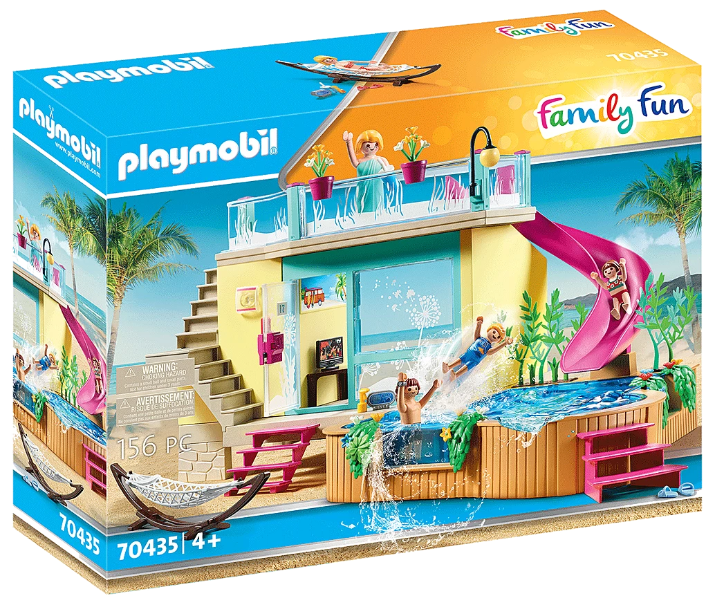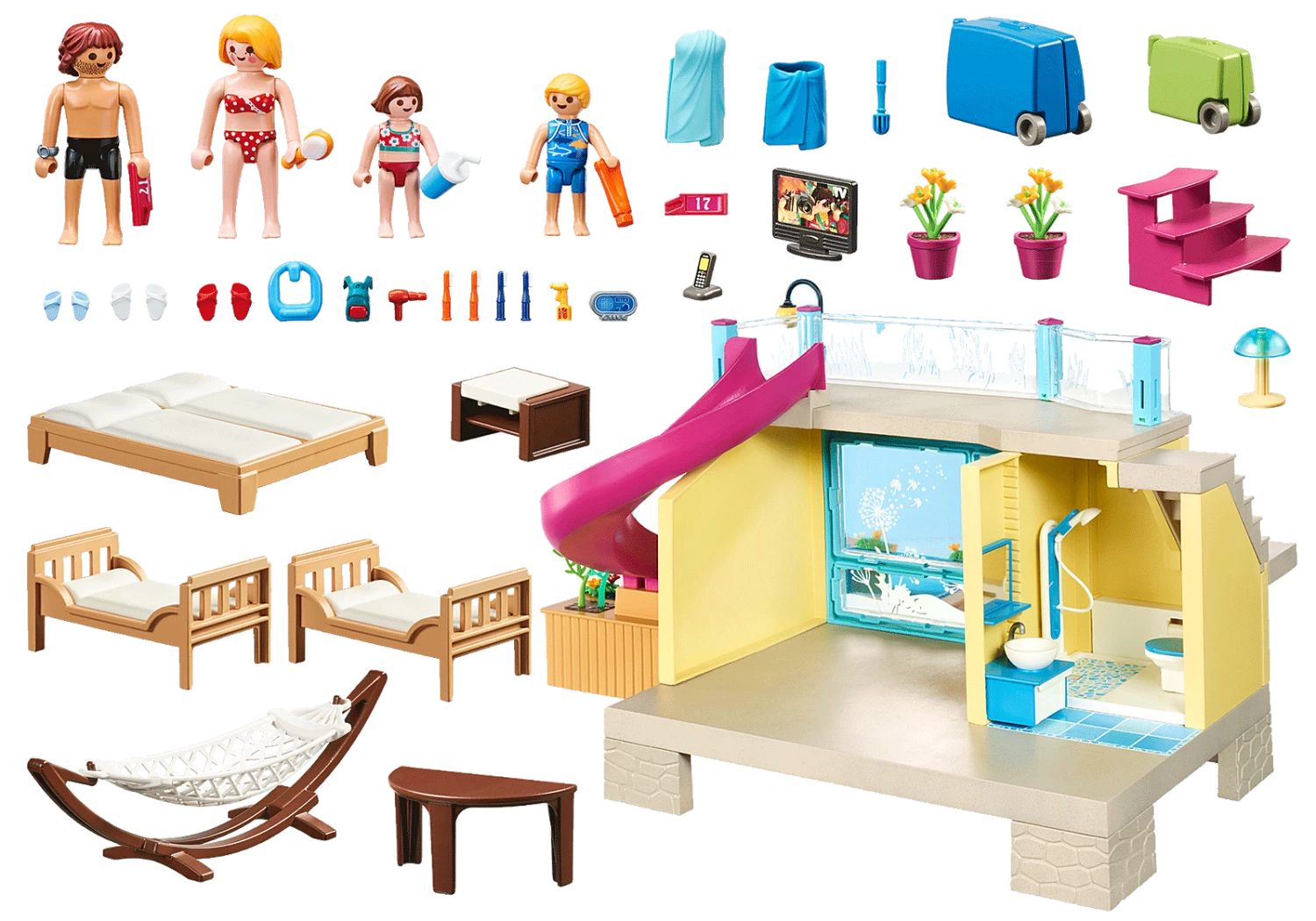 Accessories: 1 bungalow with slide and pool, 1 staircase, 2 key cards, 1 double bed, 1 bunk bed, 1 bedside table, 1 bedside lamp, 1 alarm clock, 1 TV table, 1 TV, 1 telephone, 1 toilet, 1 children’s toilet seat, 1 toilet brush, 1 washstand with washbasin, 1 shower, 1 hairbrush, 1 spray bottle, 1 hairdryer, 2 flower pots with flowers, 3 pairs of bath slippers, 4 toothbrushes, 1 toothpaste, 2 bath towels, 1 hammock, 1 wristwatch, 1 drink cup, 2 suitcases, 1 backpack