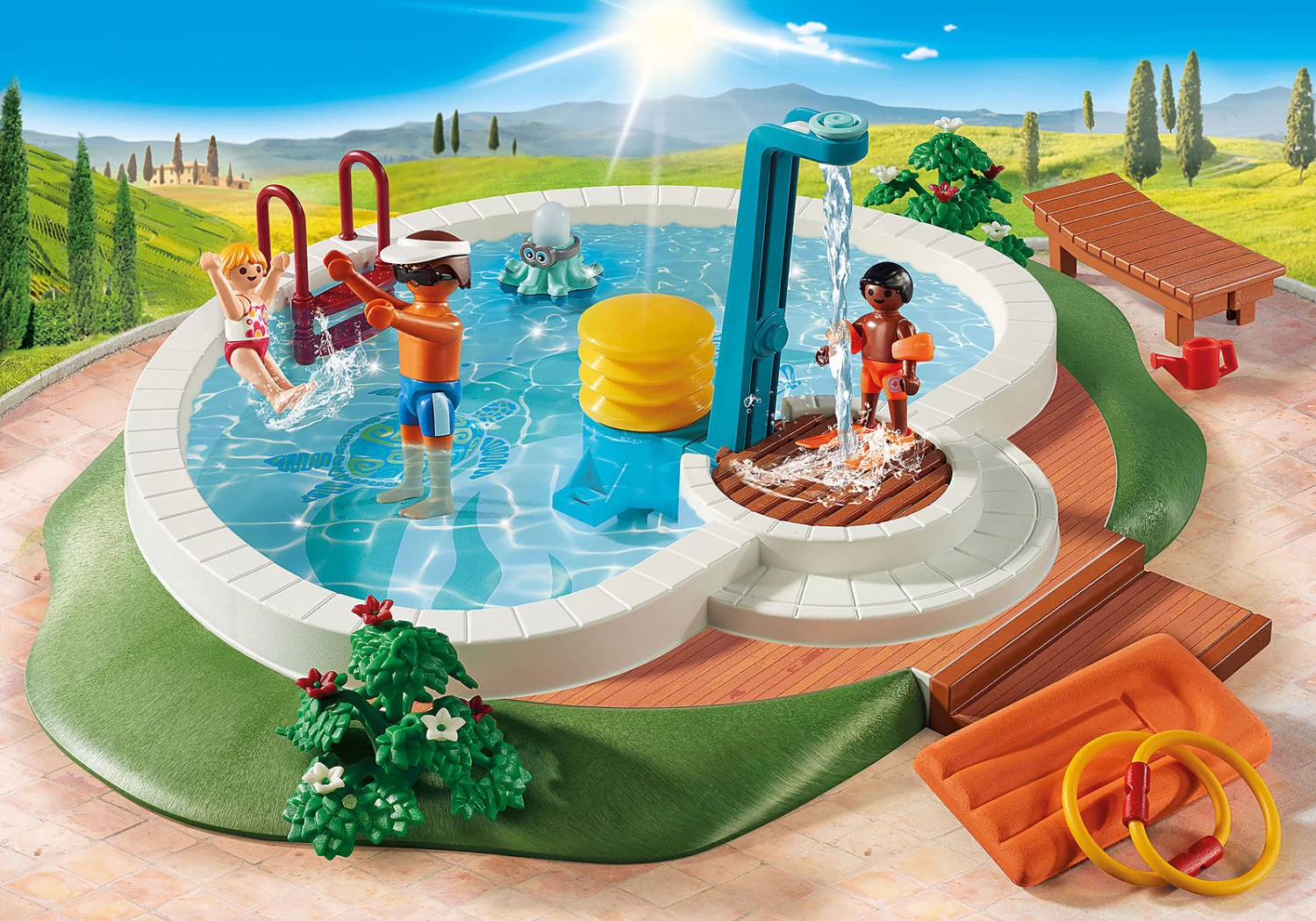 Accessories: 1 swimming pool with shower, 1 lounger, 1 pair of fins, 1 watering can, 1 water-spraying octopus, 1 air mattress, 2 swimming noodles, 1 pair of water wings, 1 sun cap