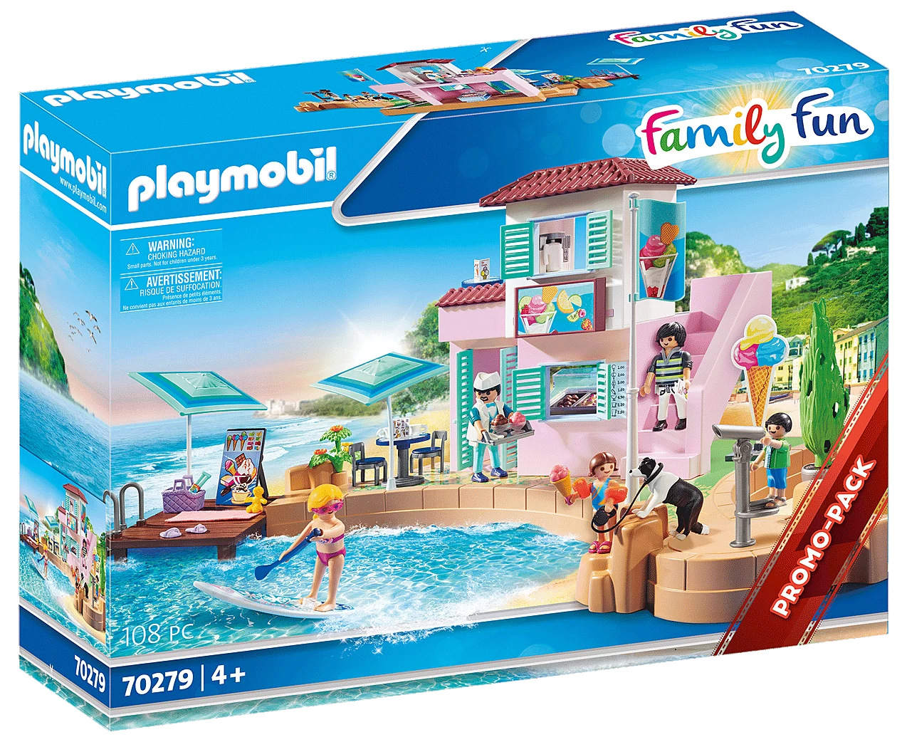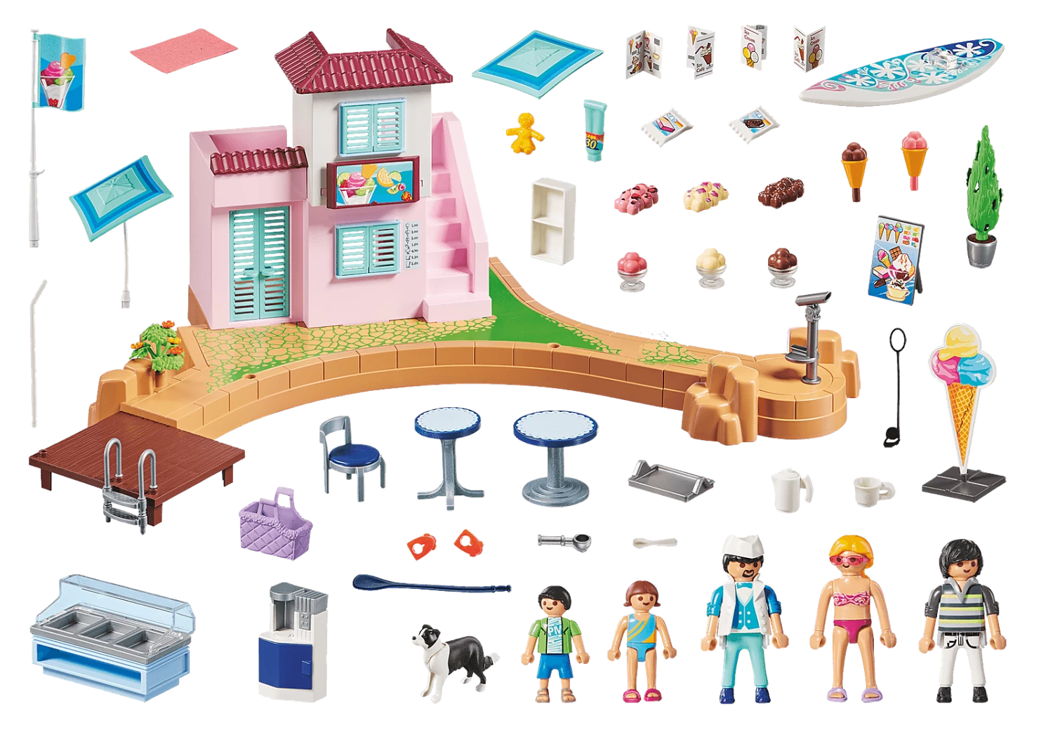 Accessories: 1 harbor ice cream parlor with boardwalk, 1 floating dock, 1 floating ladder, 2 flagpoles with flag, 1 telescope; 1 plant pot with green plant, 1 coffee machine with base cabinet, 1 shelf, 1 ice chest with glass cover and insert, 3 types of ice for ice counter, 2 tables, 2 chairs, 1 ice board, 1 advertising sign ice cone with stand, 1 tray, 1 coffee pot, 4 cups, 2 ice cream cones with ice, 3 ice cream cups with ice, 2 ice cream packs, 4 ice cream cards, 4 ice cream spoons, 1 ice cream scoop, 1 bath towel, 1 pair of water wings, 1 stand-up paddle board, 1 paddle, 1 tube, 1 basket, 1 doll, 1 dog leash, 1 pair of sunglasses, 1 cap, 2 pairs of bathing shoes