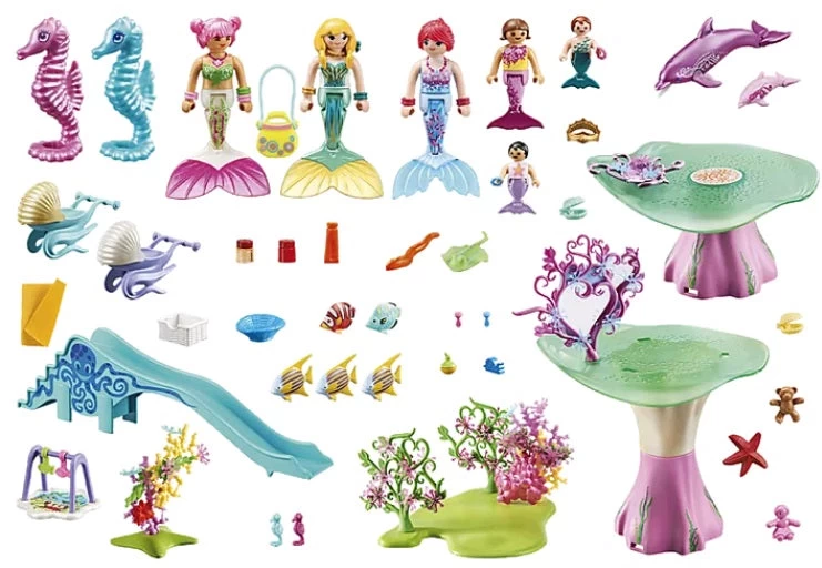 Accessories: 2 coral platforms, 1 underwater garden, 1 slide, 1 coral, 2 strollers, 1 baby activity center, 2 baskets, 3 blankets, 2 cans, 1 tube, 7 bangles, 1 handbag, 1 necklace, 2 bite rings, 2 rattles, 1 child’s crown, 2 child’s toys, 1 bear, 1 doll,