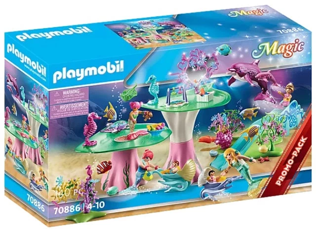 Explore the magical underwater Mermaid’s Paradise full of delight and charm. The mermaids can meet their friends to play on the slide and visit with marine life. This enchanting land is teeming with underwater life, including colorful seahorses, starfish, and dolphins. The dolphins can swim around and stand upright on their moveable fin to make it look like they are dancing in the water. Visit the play area on top of the tallest coral reef for even more fun. Playset includes three adult mermaids, one child mermaid, two baby mermaids that fit in the included baby strollers, and two coral towers with accessories, as well as a variety of sea animals such as seahorses, eel, stingray, fish, and dolphins. Small Column Dimensions: 8.3 x 7.5 x 4.3 in (LxWxH). Large Column Dimensions: 8.3 x 7.5 x 10.6 in (LxWxH).
