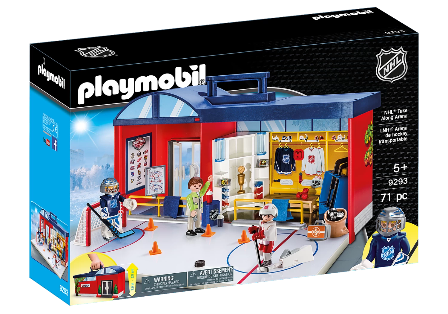 Figures: 2 hockey players, 1 referee; accessories: 1 take-away arena, 1 scoreboard, 2 dumbbells, 2 bags, 1 can, 2 towels, 4 pucks, 2 hockey sticks, 2 barriers, 2 drinks, 6 bottles, 1 arm guard, 1 glove, 1 helmet, 2 knee pads, 1 whistle, 1 first aid kit, 1 bench, 1 sack, 2 pylons, 1 winner’s trophy, 1 corner shelf, 1 changing room shelf, 1 goal net, 1 strategy board and 1 shooting aid