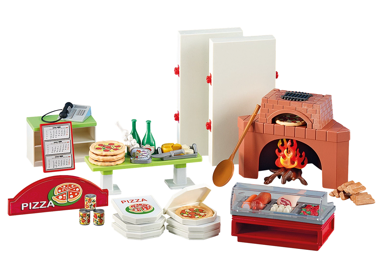 Figures:Â 1 pizza oven, 1 fire, 6 pizza boxes, 4 pizzas, 1 pizza shovel, 3 tins, 2 tins of sardines, 1 knife, 2 bottles, 1 bunch of garlic, 1 table, 1 telephone, 1 sales counter, 1 ham, 1 box of eggs, 2 sausages, 1 piece of cheese, 1 tray, 3 stacks of wood, 1 sign, 2 side panels, 8 connectors, 1 calendar, 1 cabinet
