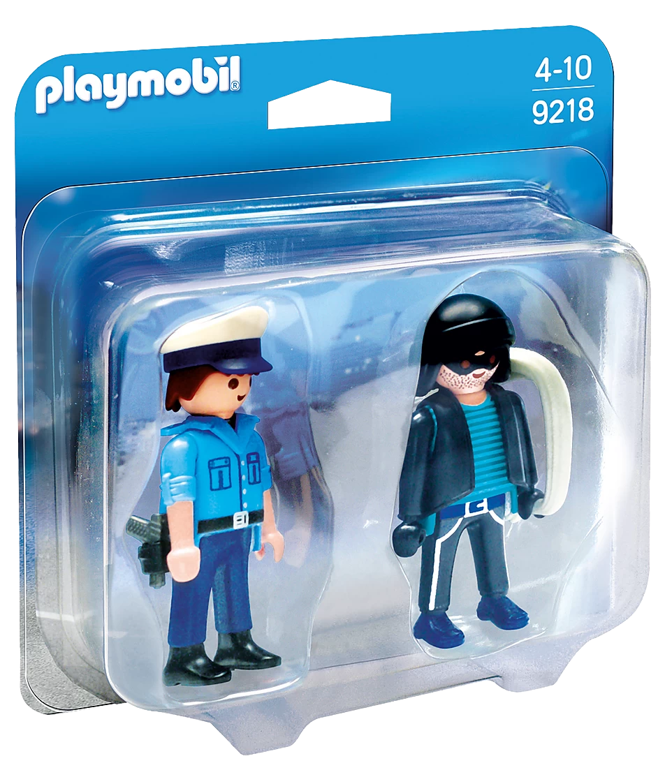 Figures: 1 policeman, 1 thief; Animals: none; accessories: 1 sack, 2 caps