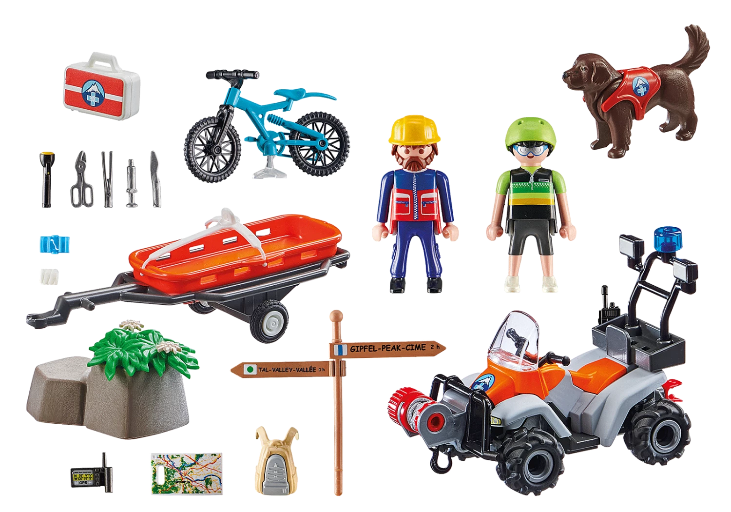 Set includes two figures, dog, bike, quad, map, first aid kit, trail signs, and other accessories. Recommended for ages five to twelve years. Warning. Choking Hazard. Small parts.