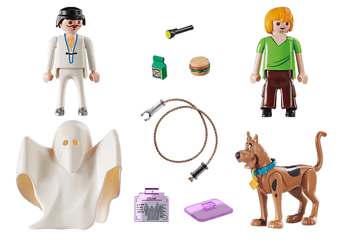 Figures: 1 Shaggy Rogers, 1 man Animals: 1 dog “Scooby-Doo” Accessories: 1 ghost cape, 1 ghost hood, 1 “ghost card”, 1 flashlight, 1 rope, 1 burger, 1 Tetra Pak, 1 stand plate for Scooby-Doo