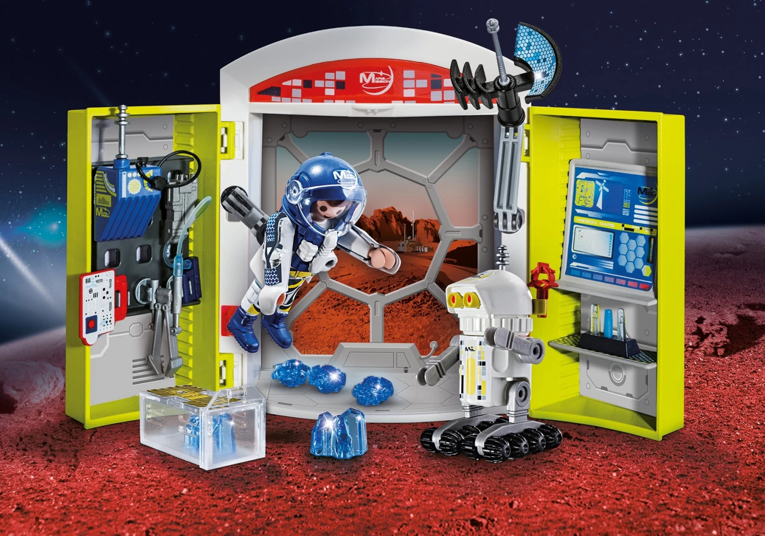 Figures:Â 1 astronaut, 1 robot, 5 crystals, 1 storage box, 3 test tubes, 1 test tube holder, 1 flipchart, 1 radar with swivel arm, 1 clipboard, 1 radio, 4 connectors, 1 grappler