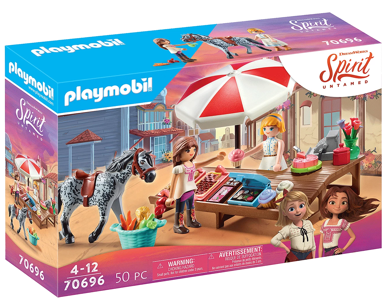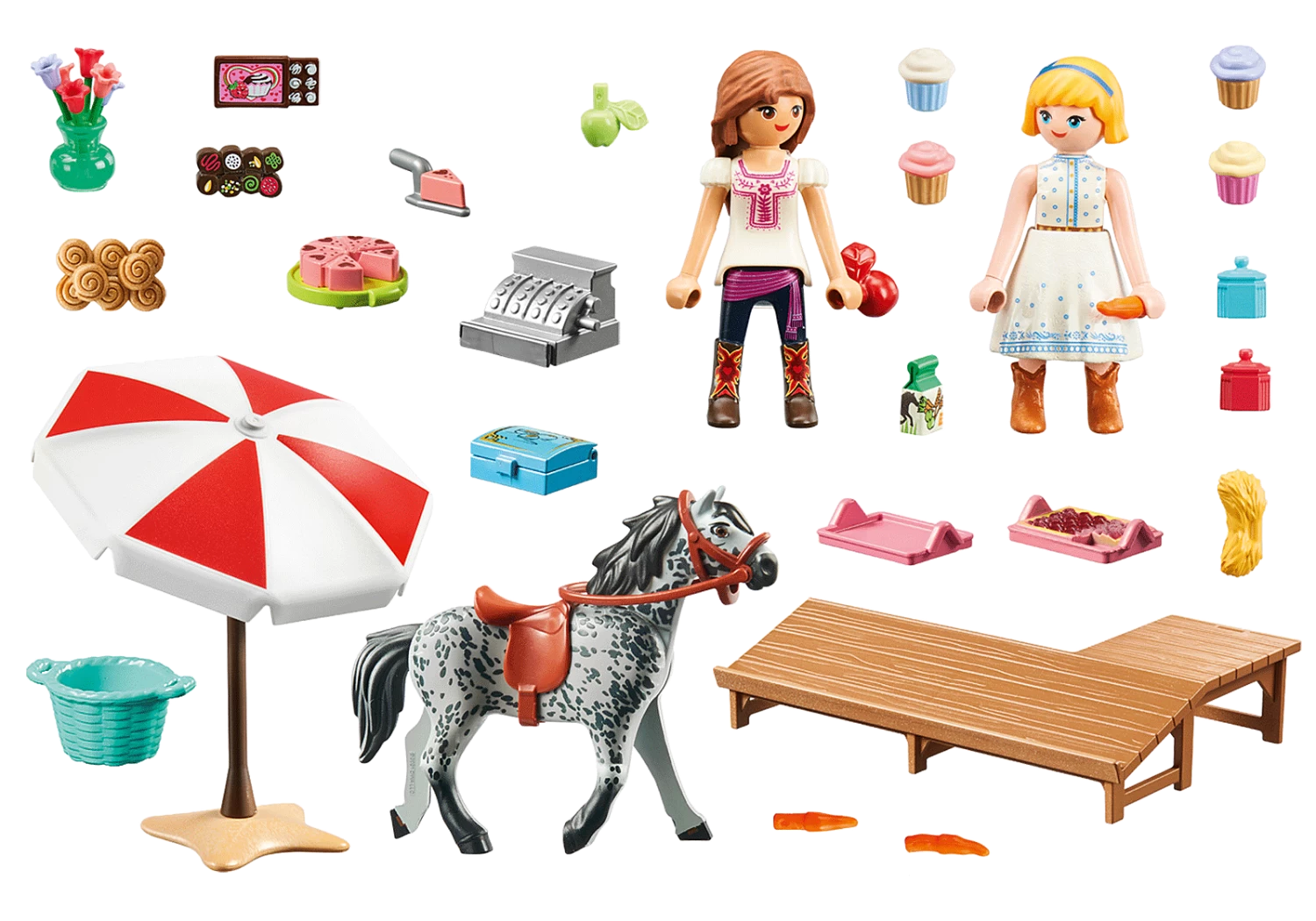 Lucky and Abigail love to take long rides with their horses through the wild prairie. Upon their return to town after an exciting adventure, they like to make a detour to the Miradero Candy Shop. So many mouth-watering delicacies are waiting here: tasty cupcakes, sweet cakes and pastries are presented at the sales-counter. With so much choice, it is not easy for the two girls to make up their minds. Especially sweet-toothed Abigail would like to try everything. Today, both girls choose a cupcake and enjoy it. Delicious! The set consists of the friends Lucky and Abigail, as well as a horse, a candy stand with cupcakes, cakes and pastries, a cash register and many other lovely extras.