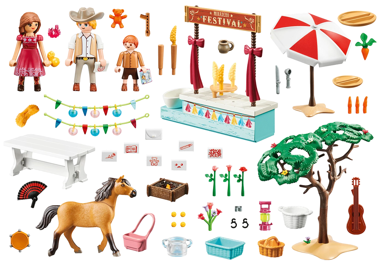 Dip into Lucky’s fascinating world and experience many exciting adventures. Together with her wild mustang Spirit, Lucky visits the Miradero Festival. There is so much to discover here: sales stands filled with hand-made toys, flowers and delicious corn sticks, colorful fairy lights and cheerful music. Spirit is naturally more interested in the fresh fruit in the basket. Lucky enjoys the cheerful festival atmosphere. After a short time she happily starts dancing on the dance floor. Just in time for its release at cinemas the new DreamWorks Spirit playsets from PLAYMOBIL are now available for young and old fans. Set includes Lucky and mustang Spirit, father Jim and Snips, two sales stalls with toys, sweets, fruit and flowers, as well as rotating platforms on which the characters can dance.