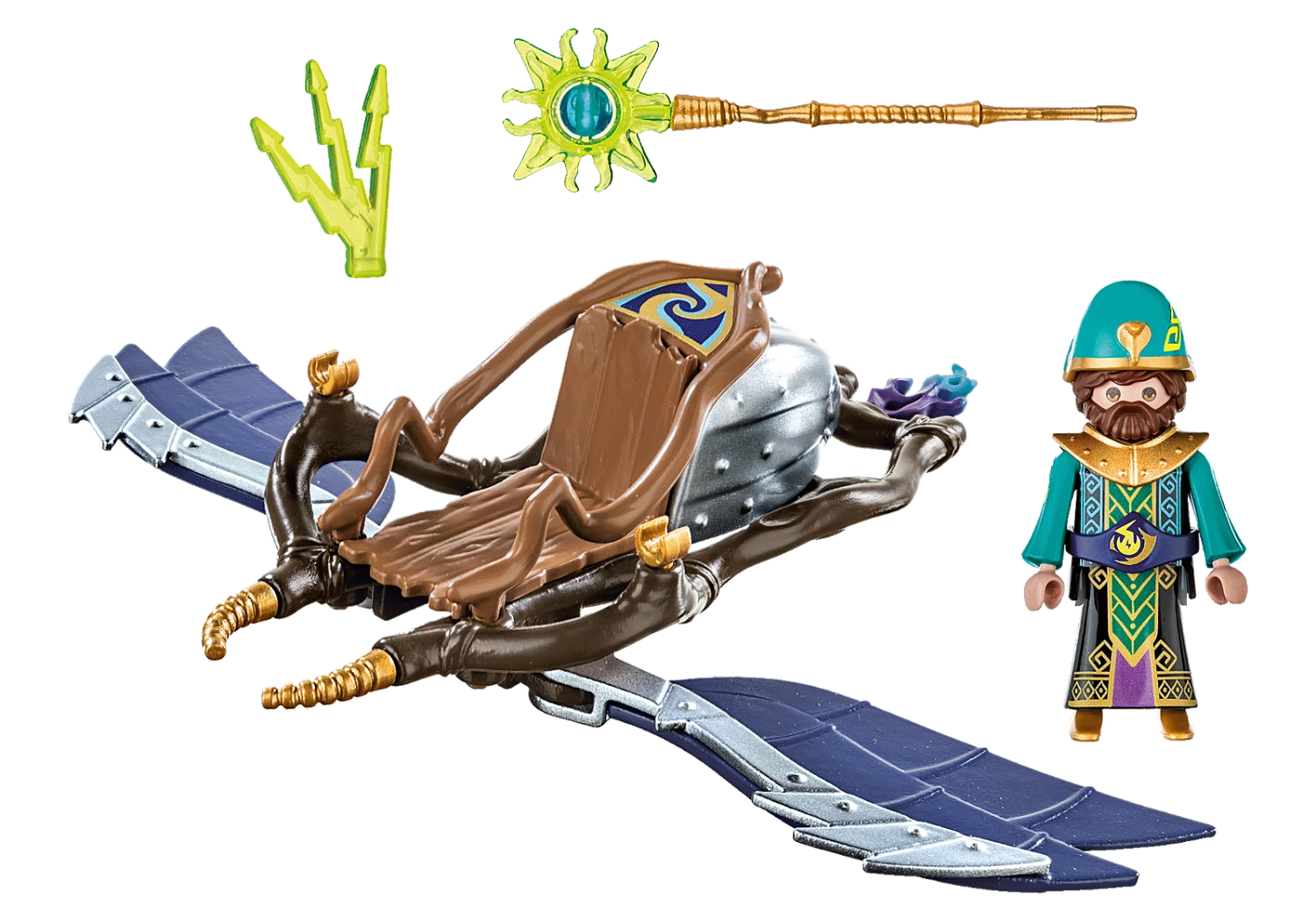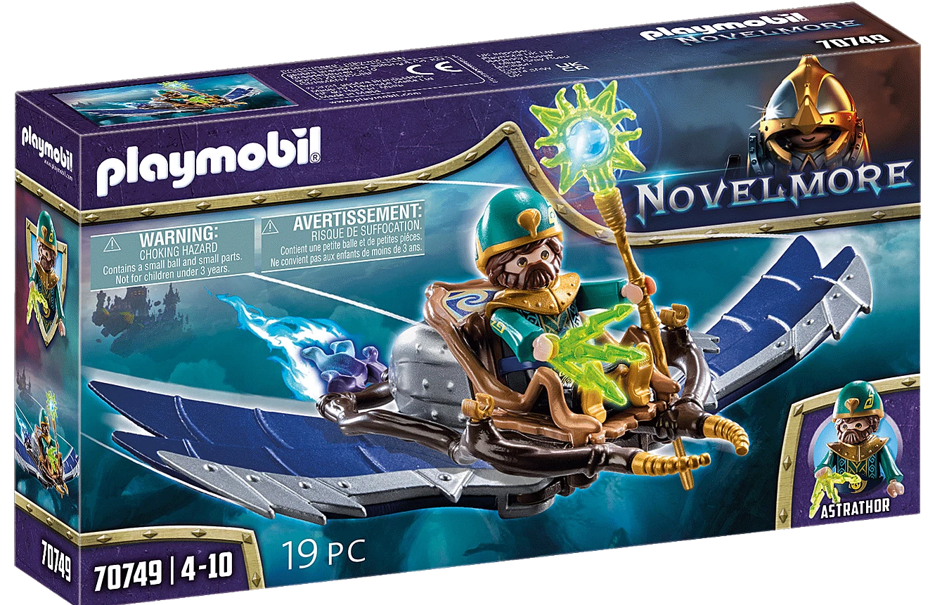 Cunning Astrathor is the magician of the air. With his wind glider, he floats across the sky as if by magic and watches out for evil forces. His magic even enables Astrathor to influence the weather. If he spots a demon, he waves his magic wand, casts a spell and in an instant a violent storm comes up. The evil spirit is quickly put to flight. The playset includes Novelmore character wizard Astrathor with magic wand and a wind glider with wings to unfold.