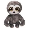 Cooper is a pastel colored, tie-dyed sloth with a pale yellow face and a grey muzzle. She has large, glittery purple button eyes surrounded by light pink patches of material, and a black button nose with an embroidered black mouth. Her hands and feet are glittery pink and she has a glittery silver horn on top of her head.